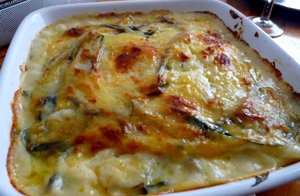 Verser les blettes dans un plat allant au four, verser dessus la sauce puis parsemez le reste gruyère.