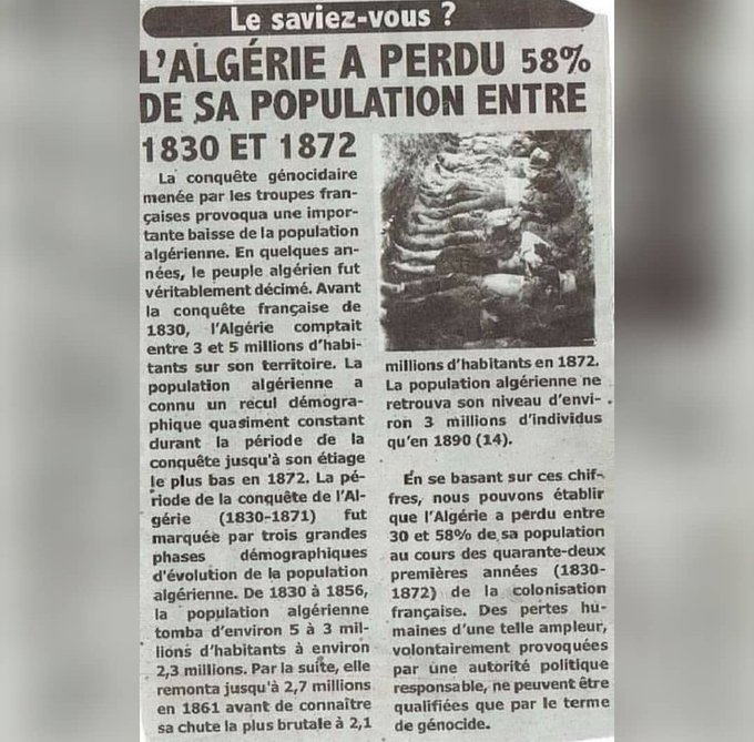 « Toutes les populations qui n'acceptent pas nos conditions doivent être rasées. Tout doit être pris, saccagé, sans distinction d'âge ni de sexe: l'herbe ne doit plus pousser où l'armée française a mis le pied. Qui veut la fin veut les moyens, quoiqu'en disent nos philanthropes. Tous les bons militaires que j'ai l'honneur de commander sont prévenus par moi-même que s'il leur arrive de m'amener un Arabe vivant, ils recevront une volée de coups de plat de sabre. [...] Voilà, mon brave ami, comment il faut faire la guerre aux Arabes : tuer tous les hommes jusqu'à l'âge de quinze ans, prendre toutes les femmes et les enfants, en charger les bâtiments, les envoyer aux îles Marquises ou ailleurs. En un mot, anéantir tout ce qui ne rampera pas à nos pieds comme des chiens. »