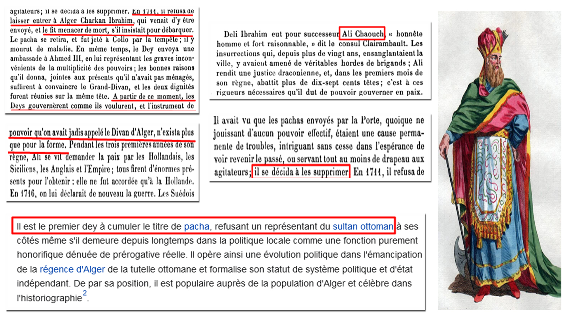 Le terme « pacha turc » est tendancieux, alors qu’il s’agit de l’Empire ottoman, la Turquie n’existant pas encore. Parlons du Dey Hussein. Deval n’était pas un vrai diplomate, mais un homme d’affaires (douteuses) investi de la fonction de consul. La vraie raison : c’est le refus de la France de payer ses dettes envers la Régence d’Alger qui lui avait évité la famine en lui vendant à crédit les cargaisons de blé nécessaires durant la crise économique de la Révolution française.