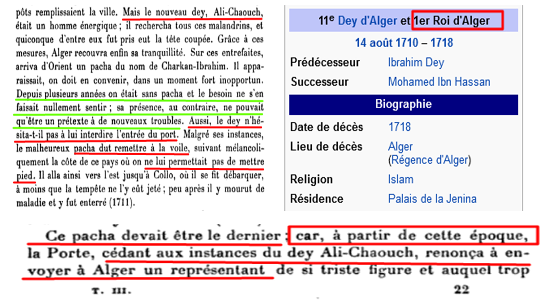 La liste de ces traités avait été dressée et publiée par un diplomate français du XIXe siècle : Eugène Plantet, « Correspondance des Deys d’Alger avec la Cour de France 1579-1833 ». Je ne sais pas si les exemplaires revenant à l’Algérie ont été restitués, mais ce qui est certain, c’est que cet acte posera un sérieux problème aux dirigeants français, en premier lieu Macron : « Alors depuis 1830 vous n’avez cessé de nous bassiner avec ce pays qui n’existait pas, et voilà que vous nous sorter 59 traités signés depuis 1579 avec ce pays en principe inexistant ? »