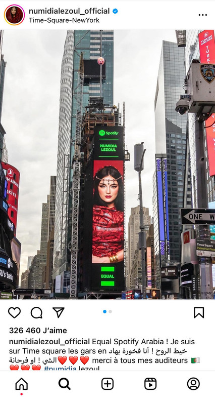 Avant cet événement historique, Numidia avait captivé l’attention de ses fans en promettant une « grosse surprise à 18h, heure algérienne ». L’excitation était palpable, et la révélation a été à la hauteur des attentes avec sa présence à Times Square. Sur les réseaux sociaux, la chanteuse a partagé une photo de ce moment épique, proclamant fièrement son partenariat avec EQUAL Spotify Arabia.