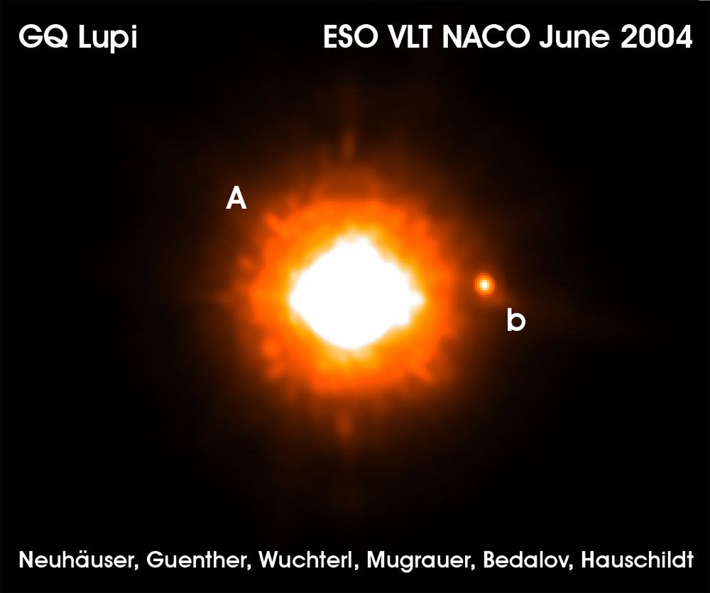 L'etoile centrale GQ Lupi (A dans la photo) est du type soleil. La planete qu'on voit en B est d'une masse evaluee a deux fois celle de jupiter et se situe a une distance egale a 100 fois celle de la terre au soleil.