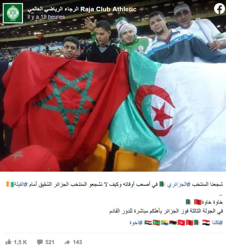 Conclure donc que les supporters maghrébins et arabes sont foncièrement contre l’Algérie, c’est aller vite en besogne. Sur les réseaux sociaux marocains, il y a certes beaucoup de commentaires défavorables à l’équipe d’Algérie dans un contexte de grave crise politique entre les deux pays, mais le Raja de Casablanca a tenu à démontrer que le discours anti-Algérie ne fait pas l’unanimité dans les milieux footballistiques marocains.