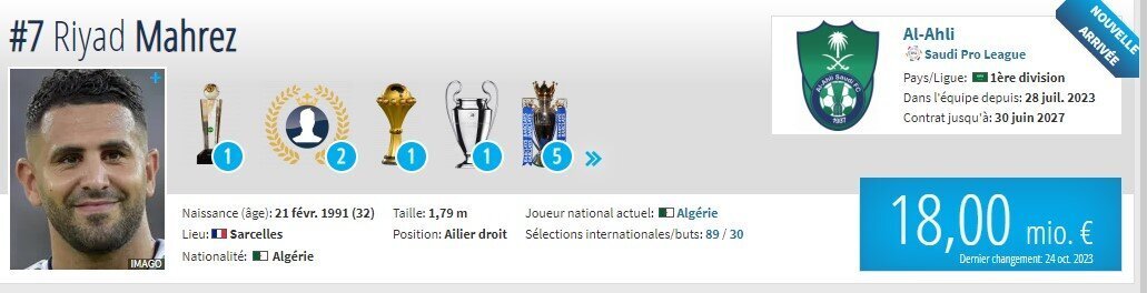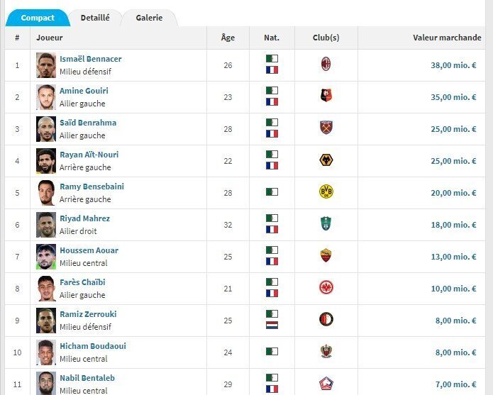 La valeur marchande des joueurs algériens (Mehrez classé 7ème)