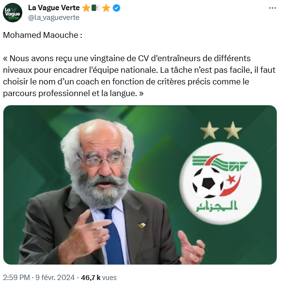 Trois noms se détachent actuellement d'après le journal Competition. D'abord Hugo Broos, le stratège belge actuellement à la tête de l'Afrique du Sud, qu'il a menée à sa première demi-finale de CAN depuis 24 ans. Ensuite, José Peseiro, le tacticien portugais qui a conduit le Nigeria jusqu'à la finale de la CAN dimanche contre la Côte d'Ivoire, et enfin, Carlos Queiroz, l'expérimenté Portugais, ancien bras droit d'Alex Ferguson à Manchester United et ex-sélectionneur du Qatar. Le média DZfoot nuance toutefois cette information en assurant qu'aucune shortliste n'a été dressée. On a aussi entendu récemment d'autres noms circuler : si la piste Hervé Renard semble trop complexe, un retour de Vahid Halilhodzic semble envisageable, tandis qu'Hubert Velud, qui ne sera pas reconduit comme sélectionneur du Burkina Faso, a manifesté son intérêt.