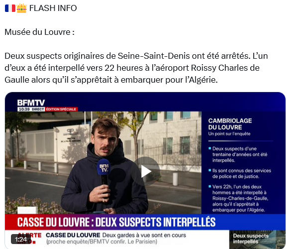 BRAQUAGE AU Musée du Louvre Deux hommes ont été interpellés en lien avec le spectaculaire vol des joyaux de la Couronne française, survenu le 19 octobre 2025 à Paris.